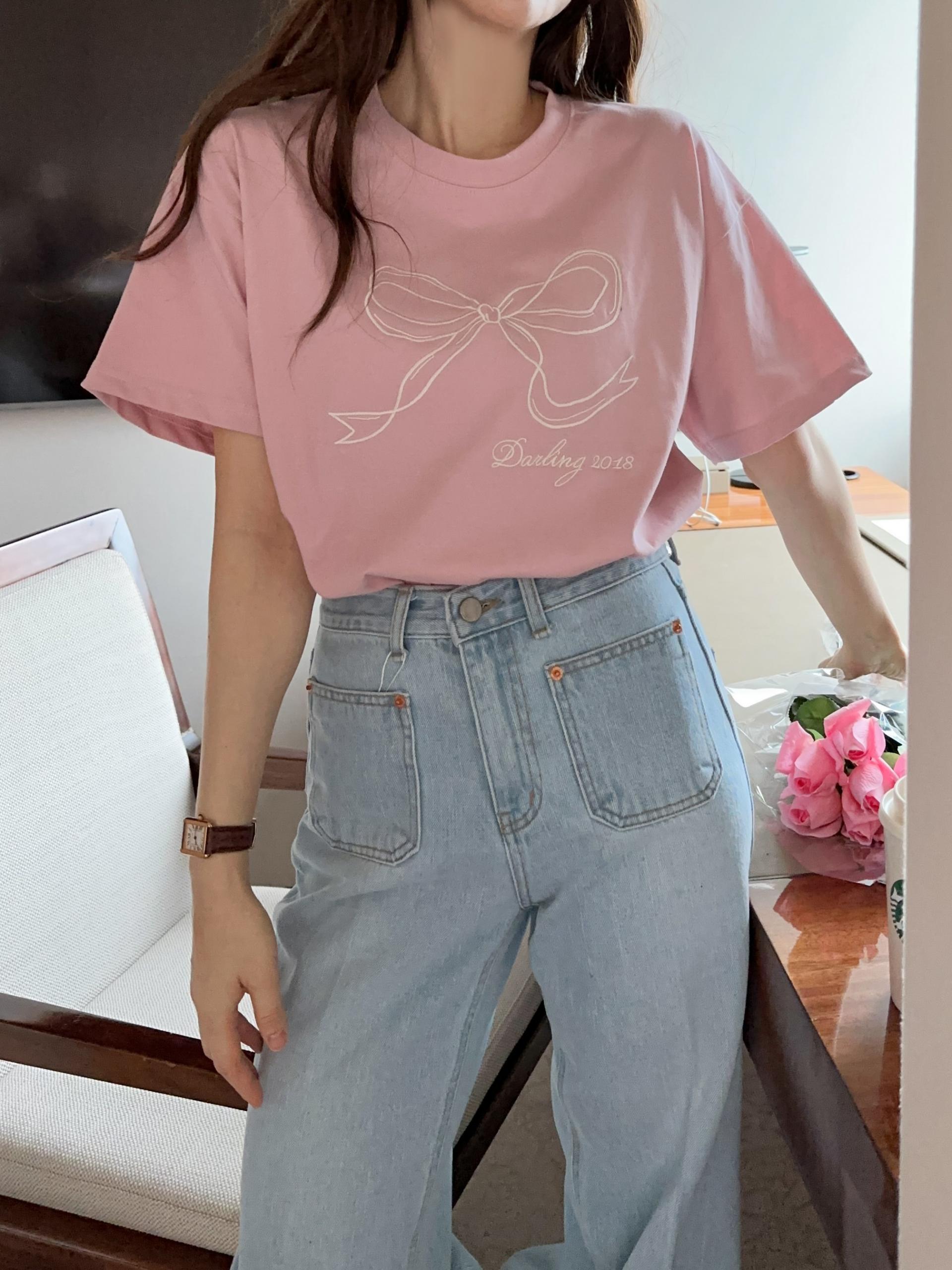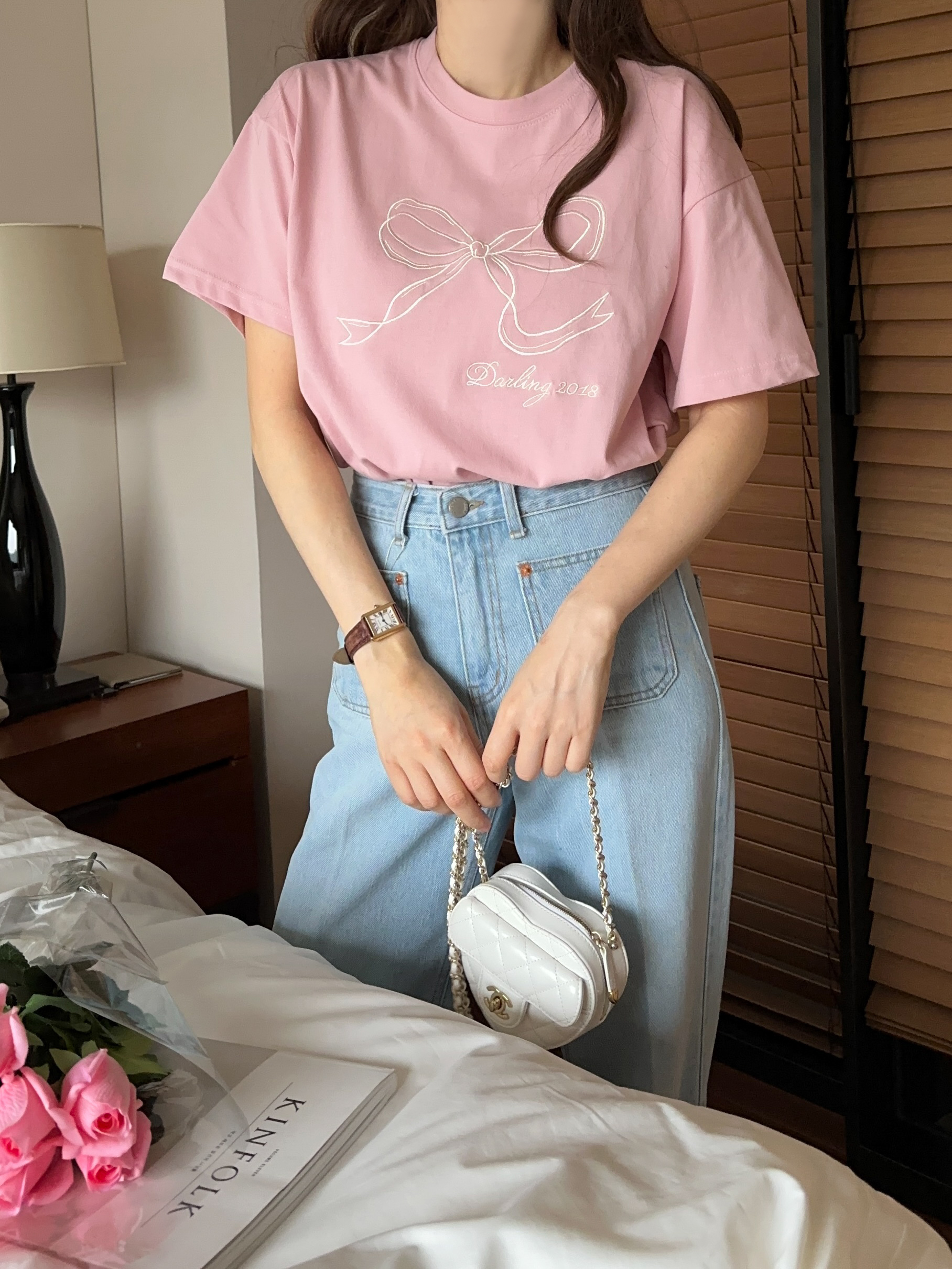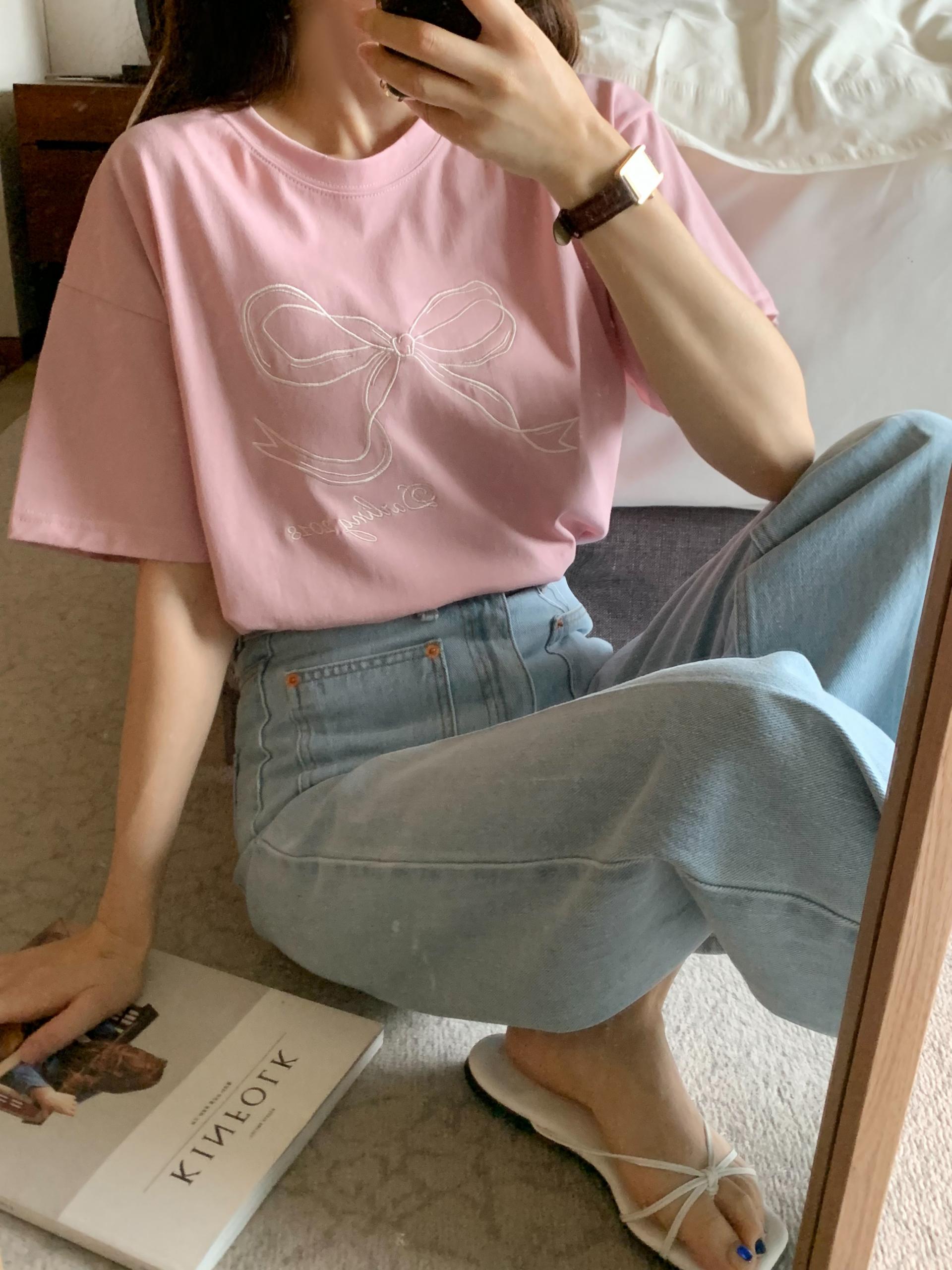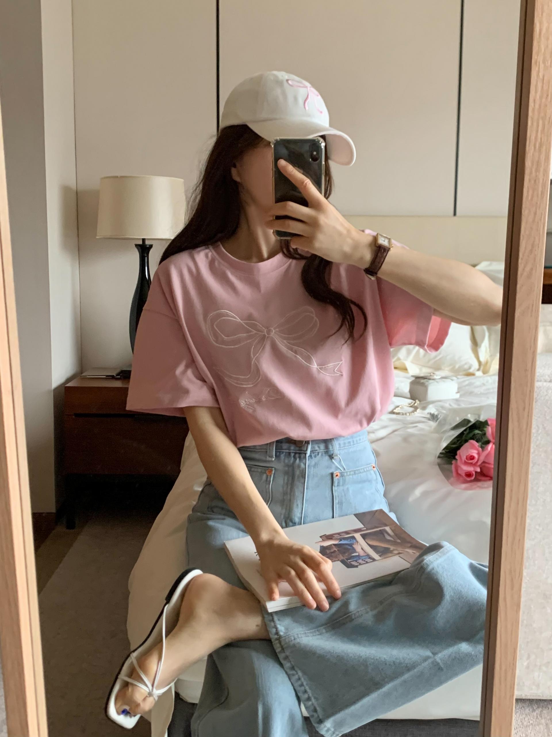 # 크롭 루즈핏 귀여운 리본 스타일 자수티 메란지 핑크 네이비