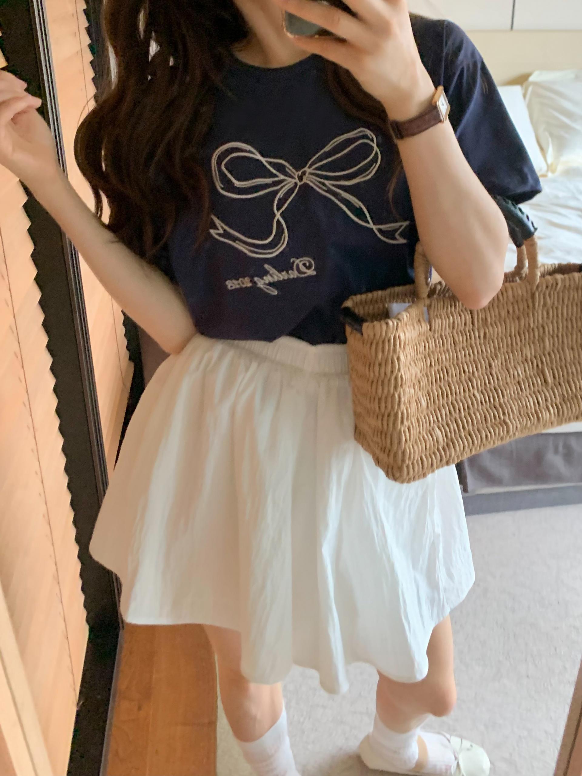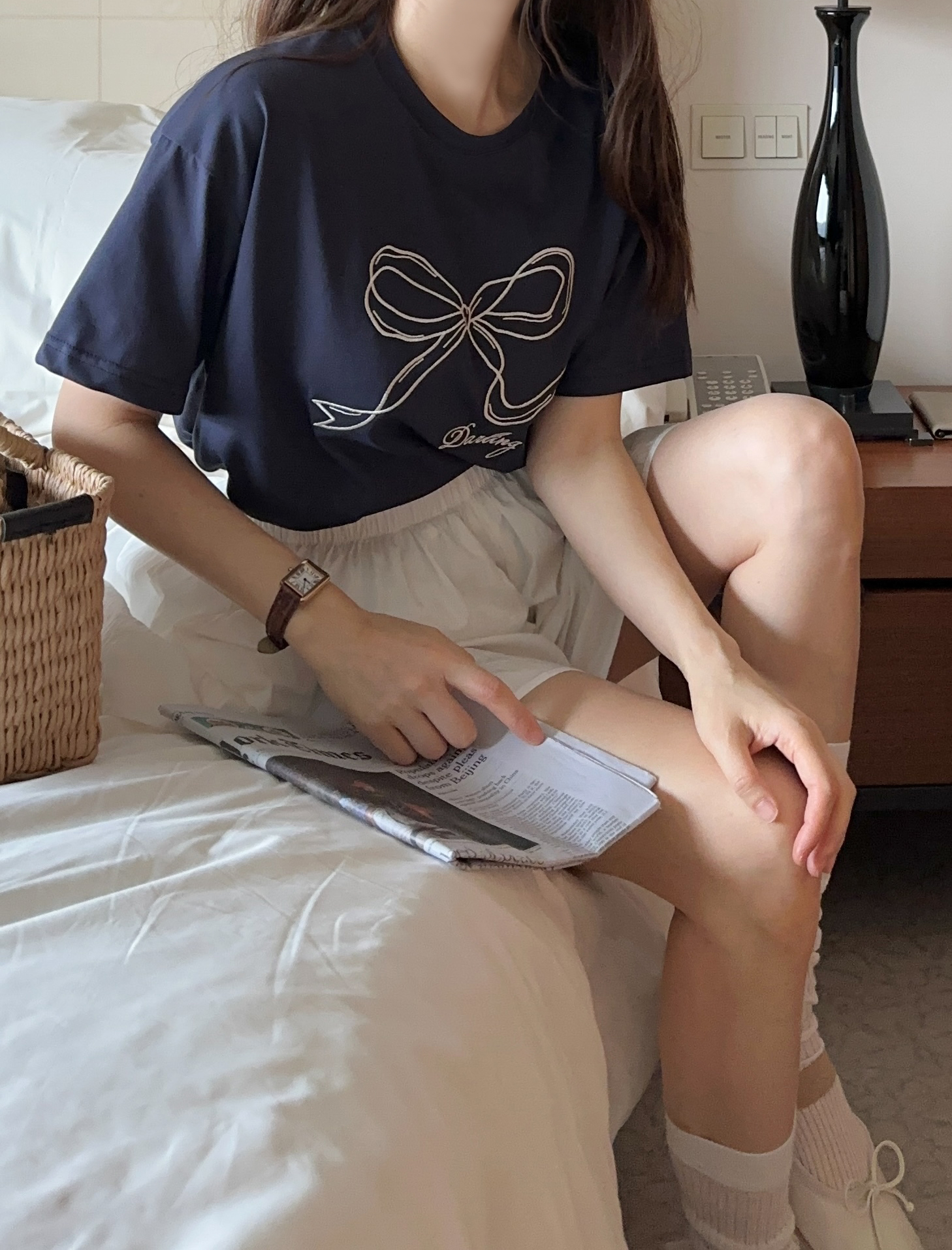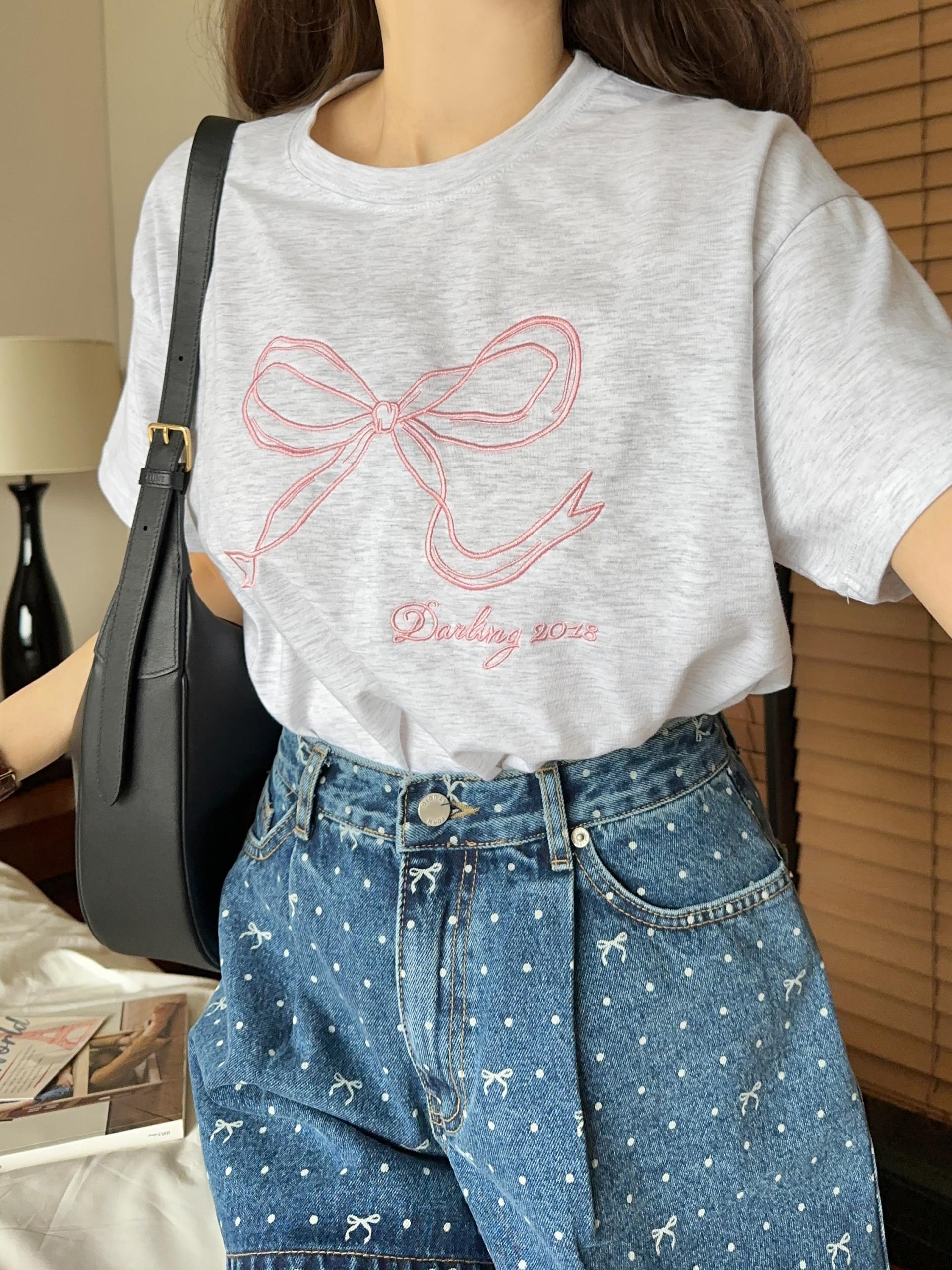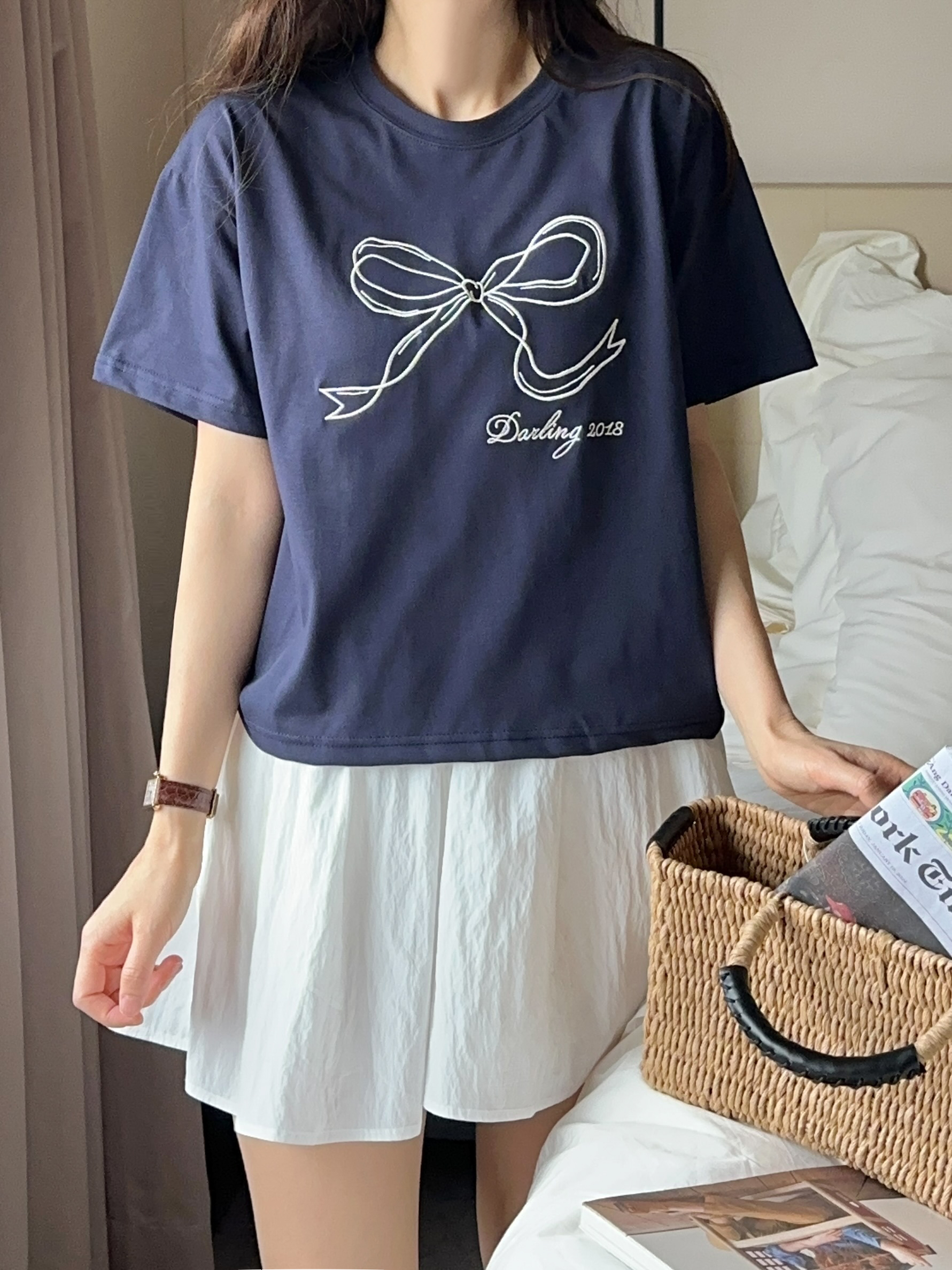# 크롭 루즈핏 귀여운 리본 스타일 자수티 메란지 핑크 네이비