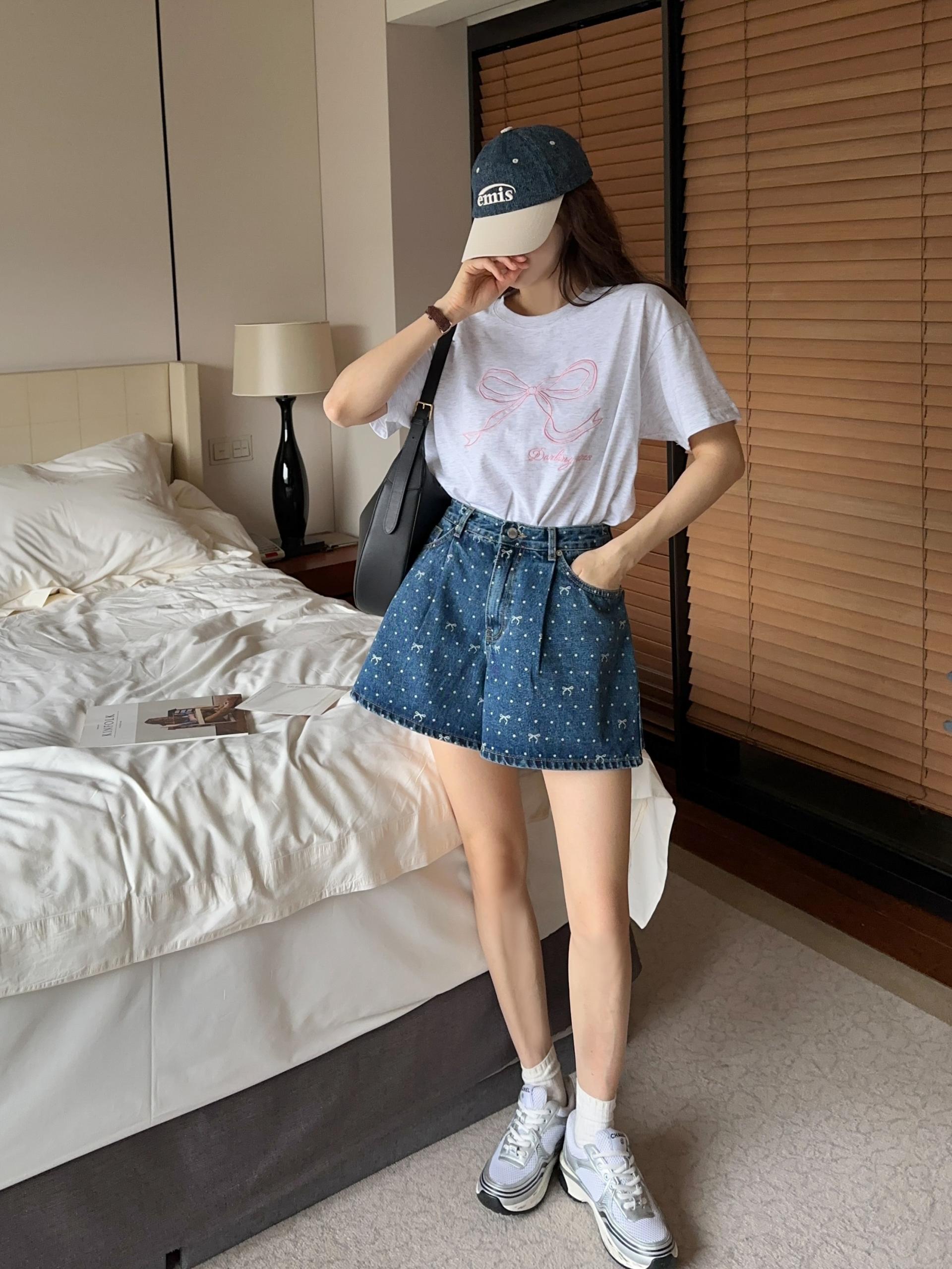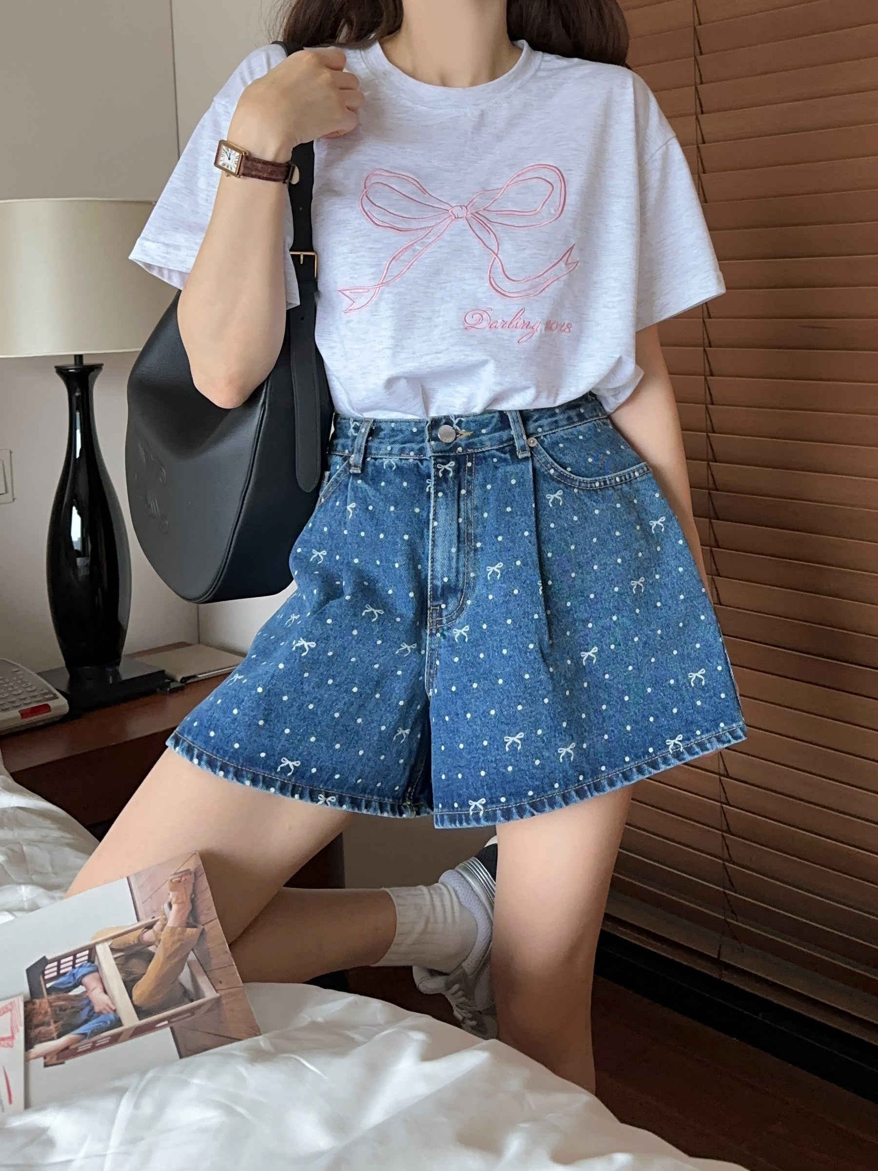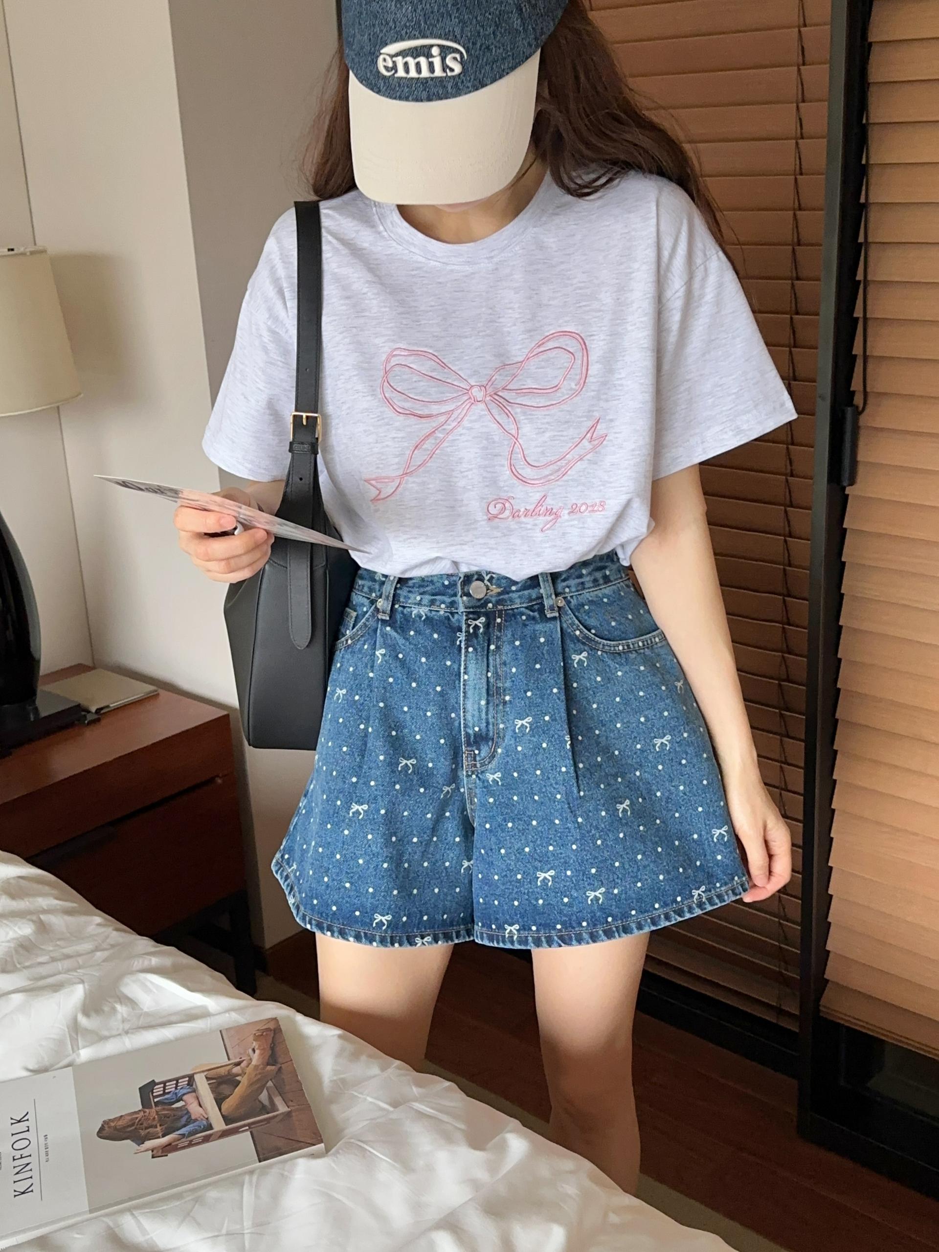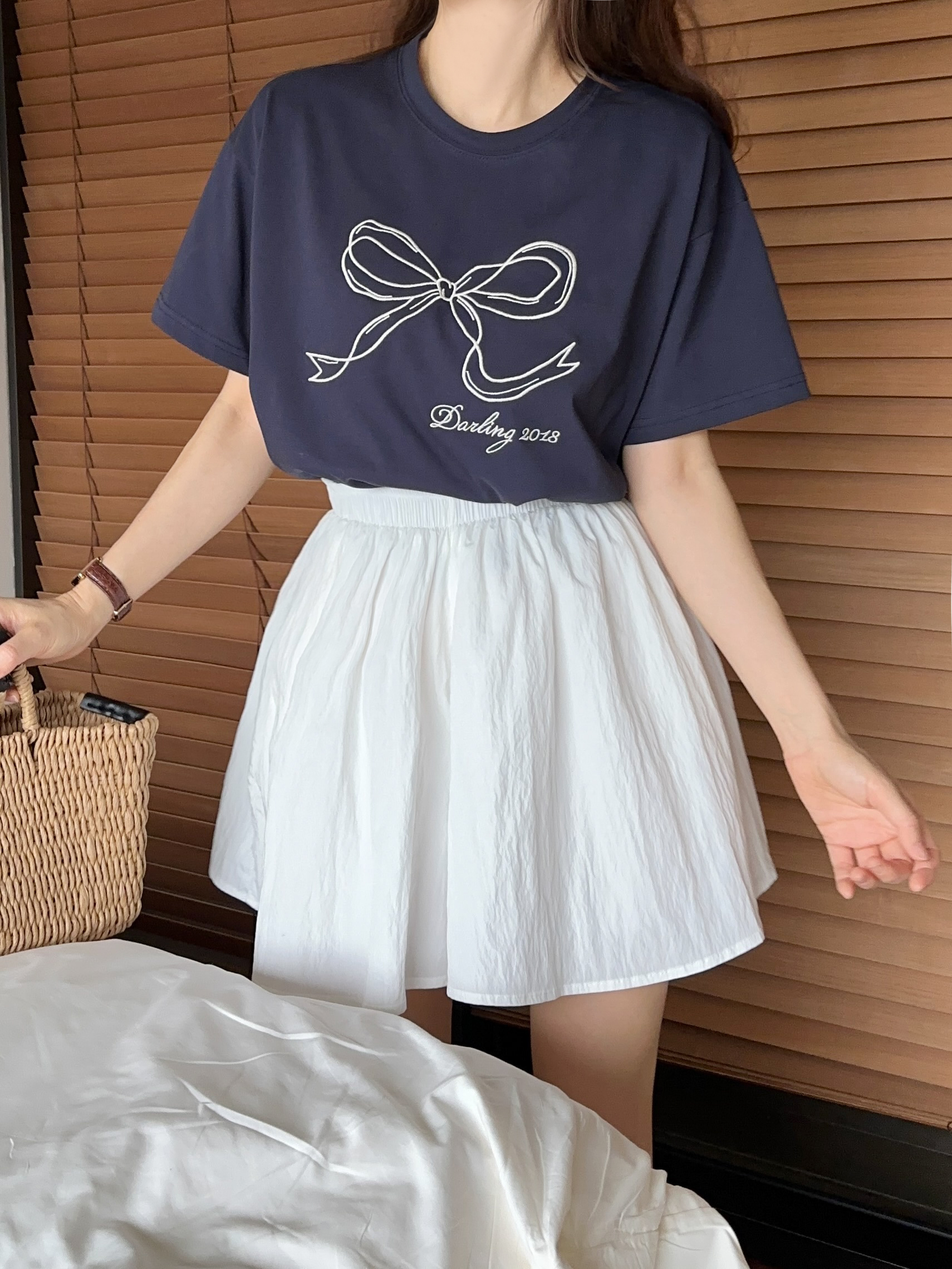 # 크롭 루즈핏 귀여운 리본 스타일 자수티 메란지 핑크 네이비